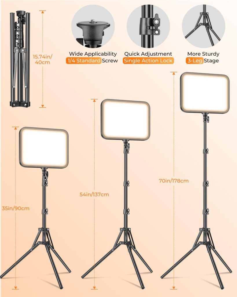 The kit comes with reinforced tripod stands that provide steady support for extended filming sessions. Although they are lightweight, the tripods hold the lights securely and can be adjusted to different heights and angles as needed. The universal 1/4-inch mounts make the lights compatible with a wide range of cameras, smartphones, and other accessories, increasing their versatility for creators who may want to expand or reposition their setup.